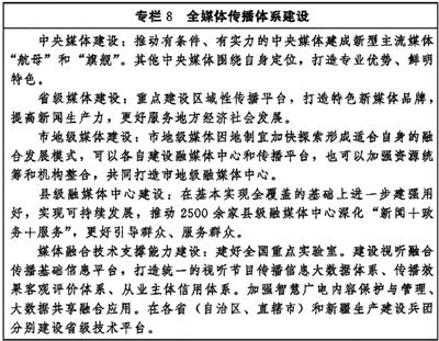 加快推進媒體深度融合發(fā)展,有效整合各種媒介資源、生產(chǎn)要素,推動在信息內(nèi)容、技術(shù)應(yīng)用、平臺終端、管理手段等方面共融互通,打造一批具有強大影響力、競爭力的新型主流媒體。統(tǒng)籌處理好傳統(tǒng)媒體和新興媒體、中央媒體和地方媒體、主流媒體和商業(yè)平臺、大眾化媒體和專業(yè)性媒體的關(guān)系,建立以內(nèi)容建設(shè)為根本、先進技術(shù)為支撐、創(chuàng)新管理為保障的全媒體傳播體系。推進內(nèi)容生產(chǎn)供給側(cè)結(jié)構(gòu)性改革,完善高質(zhì)量內(nèi)容產(chǎn)出機制,推廣互動式、服務(wù)式、場景式傳播。強化新一代信息技術(shù)支撐引領(lǐng)作用,支持主流媒體重塑采編流程、建設(shè)平臺終端、優(yōu)化管理手段、強化版權(quán)保護、打造媒體資源數(shù)據(jù)庫、提升內(nèi)容生產(chǎn)力、占據(jù)傳播制高點。創(chuàng)新媒體業(yè)態(tài)、傳播方式和運營模式,強化用戶連接,發(fā)揮制度優(yōu)勢和市場作用,增強主流媒體競爭力。(見專欄8)