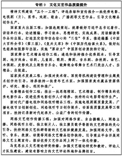 鼓勵文化單位和廣大網(wǎng)民依托網(wǎng)絡(luò)平臺依法進行文化創(chuàng)作表達,推出更多優(yōu)秀的網(wǎng)絡(luò)文學(xué)、綜藝、影視、動漫、音樂、體育、游戲產(chǎn)品和數(shù)字出版產(chǎn)品、服務(wù),推出更多高品質(zhì)的短視頻、網(wǎng)絡(luò)劇、網(wǎng)絡(luò)紀錄片等網(wǎng)絡(luò)視聽節(jié)目,發(fā)展積極健康的網(wǎng)絡(luò)文化。實施網(wǎng)絡(luò)精品出版、網(wǎng)絡(luò)音樂產(chǎn)業(yè)扶持計劃。加強各類網(wǎng)絡(luò)文化創(chuàng)作生產(chǎn)平臺建設(shè),鼓勵對網(wǎng)絡(luò)原創(chuàng)作品進行多層次開發(fā),引導(dǎo)和規(guī)范網(wǎng)絡(luò)直播等健康發(fā)展。加強和創(chuàng)新網(wǎng)絡(luò)文藝評論,推動文藝評獎向網(wǎng)絡(luò)文藝創(chuàng)作延伸。(見專欄9)