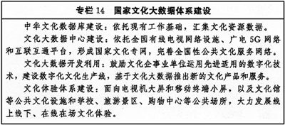 加強規(guī)劃引導(dǎo)和政策指導(dǎo),打通各層級公共文化數(shù)字平臺,打造公共文化數(shù)字資源庫群,建設(shè)國家文化大數(shù)據(jù)體系。統(tǒng)籌推進公共文化數(shù)字化重點工程建設(shè),把服務(wù)城鄉(xiāng)基層特別是農(nóng)村作為著力點,不斷縮小城鄉(xiāng)之間的數(shù)字鴻溝。建設(shè)智慧圖書館體系和國家公共文化云,建設(shè)智慧博物館,打造智慧廣電、電影數(shù)字節(jié)目管理等信息數(shù)字化服務(wù)平臺。積極發(fā)展云展覽、云閱讀、云視聽、云體驗,促進供需在“云端”、“指尖”對接。推進農(nóng)家書屋數(shù)字化建設(shè),建立智能化管理體系。(見專欄14)
