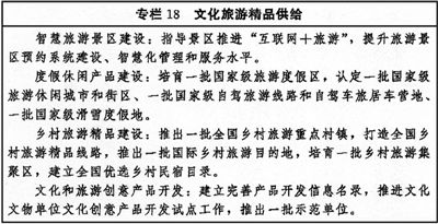 適應(yīng)大眾旅游時代新要求,推進旅游為民,推動構(gòu)建類型多樣、分布均衡、特色鮮明、品質(zhì)優(yōu)良的旅游供給體系,推動文化和旅游業(yè)態(tài)融合、產(chǎn)品融合、市場融合。提升旅游演藝、文化遺產(chǎn)旅游、文化主題酒店、特色節(jié)慶展會等品質(zhì),支持建設(shè)集文化創(chuàng)意、旅游休閑等于一體的文化和旅游綜合體。依托革命博物館、黨史館、紀念館、革命遺址遺存遺跡等,打造紅色旅游經(jīng)典景區(qū)和經(jīng)典線路。利用鄉(xiāng)村文化傳統(tǒng)和資源,發(fā)展鄉(xiāng)村旅游。加強對當代社會主義建設(shè)成就的旅游開發(fā),深入挖掘重大工程項目的精神內(nèi)涵,發(fā)展特色旅游。加強對工業(yè)遺產(chǎn)資源的活化利用,開發(fā)旅游用品、特色旅游商品,培育旅游裝備制造業(yè),發(fā)展工業(yè)旅游。推動旅游與現(xiàn)代生產(chǎn)生活有機結(jié)合,加快發(fā)展度假休閑旅游、康養(yǎng)旅游、研學(xué)實踐活動等,打造一批國家全域旅游示范區(qū)、A級旅游景區(qū)、國家級旅游度假區(qū)、國家精品旅游帶、國家旅游風(fēng)景道、特色旅游目的地、特色旅游功能區(qū)、城市綠道、騎行公園和慢行系統(tǒng)。大力發(fā)展智慧旅游,推進智慧景區(qū)、度假區(qū)建設(shè)。