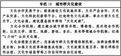 加強區(qū)域文化協(xié)同創(chuàng)新,健全合作互助、扶持補償機制,推動?xùn)|部地區(qū)以創(chuàng)新引領(lǐng)文化發(fā)展,加大力度支持中西部地區(qū)以及東北等老工業(yè)基地文化發(fā)展,扶持革命老區(qū)、民族地區(qū)、邊疆地區(qū)文化發(fā)展,形成相互促進、優(yōu)勢互補、融合互動的區(qū)域文化發(fā)展格局。圍繞京津冀協(xié)同發(fā)展、長江經(jīng)濟帶發(fā)展、粵港澳大灣區(qū)建設(shè)、長三角一體化發(fā)展、黃河流域生態(tài)保護和高質(zhì)量發(fā)展等區(qū)域重大戰(zhàn)略,健全推進區(qū)域內(nèi)文化協(xié)同發(fā)展機制,提升公共文化設(shè)施互聯(lián)互通水平,加強區(qū)域文化產(chǎn)業(yè)帶建設(shè),實現(xiàn)區(qū)域文化建設(shè)水平整體提高。促進形成文化產(chǎn)業(yè)發(fā)展新格局,創(chuàng)新城市群文化一體化發(fā)展體制機制,共建高水平合作平臺,加強公共文化服務(wù)便利共享。完善以城帶鄉(xiāng)、城鄉(xiāng)融合的文化發(fā)展體制機制,發(fā)揮城市帶動輻射作用,加快城鄉(xiāng)間文化要素雙向流動,形成以點帶面、特色鮮明、優(yōu)勢互補、均衡配置的城鄉(xiāng)文化發(fā)展新格局。(見專欄19)