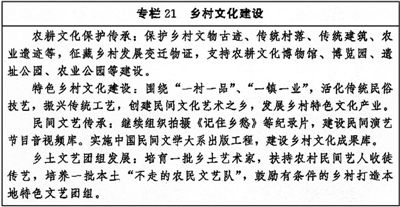 充分發(fā)揮文化傳承功能,全面推進鄉(xiāng)村文化振興,推動鄉(xiāng)村成為文明和諧、物心俱豐、美麗宜居的空間。加強農(nóng)耕文化保護傳承,支持建設(shè)村史館,修編村史、村志,開展村情教育。把鄉(xiāng)土特色文化融入鄉(xiāng)村建設(shè),留住鄉(xiāng)情鄉(xiāng)愁。創(chuàng)新支持和激勵方式,將優(yōu)秀文化資源轉(zhuǎn)化為鄉(xiāng)村永續(xù)發(fā)展的優(yōu)質(zhì)資產(chǎn),推動鄉(xiāng)村文化建設(shè)與經(jīng)濟社會發(fā)展良性互促。探索以志愿服務(wù)等方式,發(fā)展民間優(yōu)秀文化機構(gòu)、文藝團體。鼓勵鄉(xiāng)村自辦文化,支持農(nóng)民辦自己的文化藝術(shù)節(jié)、詩歌故事會、劇團演出、書畫攝影創(chuàng)作展等。增加鄉(xiāng)村優(yōu)秀文化產(chǎn)品與服務(wù)供給,推進文化結(jié)對幫扶,鼓勵“三農(nóng)”題材文藝創(chuàng)作生產(chǎn),扶持具有鄉(xiāng)土特色的文藝創(chuàng)作。開展“互聯(lián)網(wǎng)+中華文明”行動計劃,推進數(shù)字文化資源進鄉(xiāng)村。探索建立鄉(xiāng)村文化交流交易平臺,活躍鄉(xiāng)村文化市場。(見專欄21)