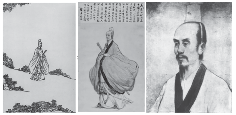 左:陳洪綬《屈子行吟圖》中的屈原形象;中:蔣兆和繪制、郭沫若題詞的《屈原像圖軸》,此為文聯(lián)紀(jì)念會場懸掛的《屈原像》;右:世界四大文化名人紀(jì)念大會會場懸掛的《屈原像》