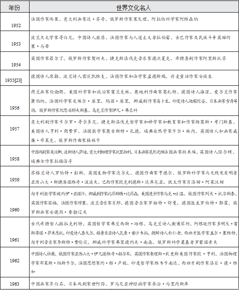 [23]1955 年的世界文化名人紀(jì)念還包括印度阿旃陀壁畫一千五百周年紀(jì)念,《堂·吉訶德》出版三百五十周年紀(jì)念與《草葉集》出版一百周年紀(jì)念。