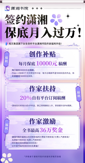 9月14日,閱文集團(tuán)旗下瀟湘書院發(fā)布全新作家福利,升級(jí)推出瀟湘開站四大福利,含保底稿酬月入過萬,全年全書最高36萬元獎(jiǎng)金激勵(lì)等。這是瀟湘書院投入一億資金扶持女性創(chuàng)作者,重磅發(fā)布“紫竹計(jì)劃”后的重要舉措。