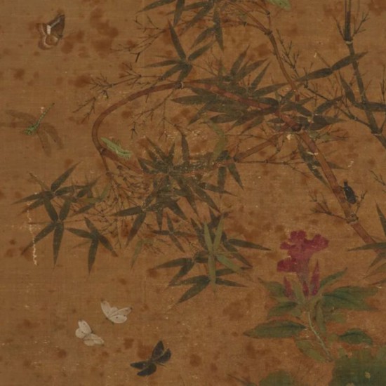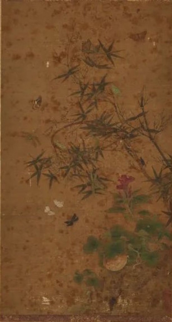 趙昌喜歡折枝花草,極富生意,著色有突出成就,在宮廷黃家富貴一體花鳥畫盛行的時候,以充滿生機(jī)、活潑鮮明的用筆表現(xiàn)富有野趣的自然花蟲草蝶,體現(xiàn)了極富個性的花鳥畫風(fēng)。在這幅《竹蟲圖軸》中,作者以細(xì)膩的筆法和鮮麗的賦彩,寫實地描繪出曲竹、以及周圍的地瓜、雞冠花、蝴蝶、蜻蜓、金鐘兒、紡織娘等草蟲。一般認(rèn)為草蟲圖中描繪的花草和昆蟲各有寓意。例如:瓜的寓意是子孫興旺長久,雞冠花上與蟈蟈,表示出人頭地的“官上加官”吉祥之意。本圖中雖未畫有蟈蟈,但推測是以雞冠花來表示出人頭地的寓意。