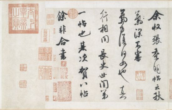 《張季明帖》:“余收張季明帖,云’秋氣深,不審氣力復(fù)何如也’,真行相間,長史世間第一帖也。其次《賀八帖》,余非合書。”