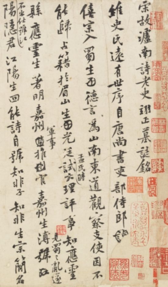 而《宋盧南詩老史翊正墓志銘稿》,凡二十一行,另補(bǔ)寫五行,行二十字左右。全稿文字涂改約二十處,亦非定稿本。“瀘南詩老”史扶,字翊正。史氏家族自唐僖宗年間入蜀,占籍于眉山。史氏少時篤學(xué)能詩,然屢試科舉不第,后游瀘州,閉門讀書并教授弟子,士人推與之曰“詩老”。紹圣三年(1096)四月卒于瀘州,葬于元符二年(1099)正月。時黃庭堅貶官戎州(今四川宜賓),史扶嫡次子史鎮(zhèn)遂請為撰墓志銘。此墓志銘稿無署款及年月,因其中有"葬以元符二年正月癸亥",徐邦達(dá)先生《古書畫過眼要錄》定此墓志銘為元符二年所作,時山谷五十五歲。