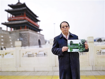 陳平原手拿老照片在永定門城樓前
