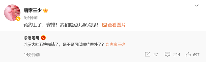 面對潘粵明的許愿:“斗羅大陸五快完結(jié)了,是不是可以期待番外了?”,唐家三少回應稱:“預約上了,安排!我們晚點兒起點見!”