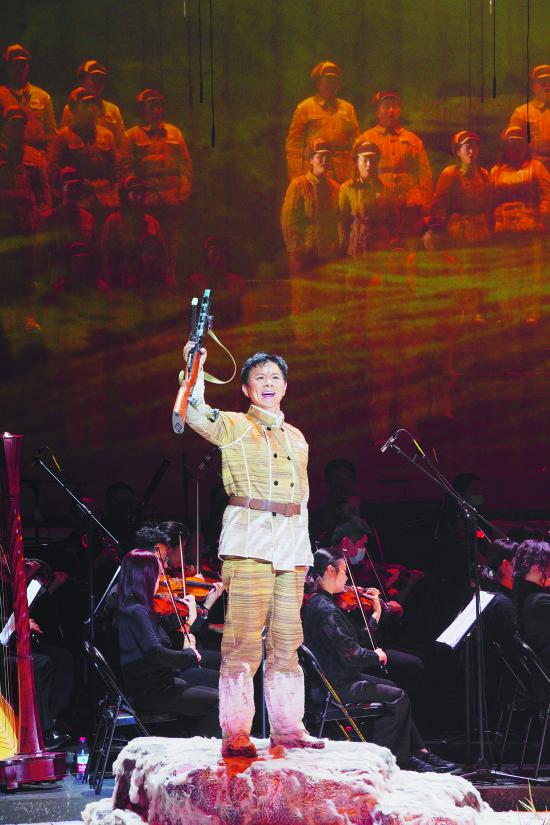 當然,一部優(yōu)秀的舞臺作品離不開藝術家的二度創(chuàng)作。男高音歌唱家王宏偉從軍30余年,有不少家喻戶曉的代表作,塑造過一個個生動鮮活的人物形象。黃繼光在他的演繹之下亦別具魅力。從音樂表現(xiàn)來看,王宏偉以清亮高亢的嗓音將人物的唱段詮釋得淋漓盡致。《抬頭仰望夜黑的天》是黃繼光與戰(zhàn)友失散后于山林間的一段內心獨白,抬頭仰望夜空,他想起家中年邁的母親,想起祖國親人的囑托,情緒從茫茫無依到想起歸宿,風格從極致浪漫到堅定激昂,王宏偉通過這段演唱將人物內心情緒的轉變詮釋得立體飽滿。戰(zhàn)斗打響之前,黃繼光一段《等我把立功喜報寄回家》的演唱,纏綿中帶著激昂,慷慨中繞著思念,將親情、戰(zhàn)友情和思念祖國的鄉(xiāng)情三位一體地展現(xiàn)了出來。