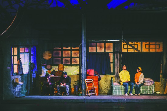 話劇《鐘鼓樓》以匠人精神投身于舞臺(tái)藝術(shù)創(chuàng)作,通過“模塊化的組合”呈現(xiàn)出令人驚喜的藝術(shù)光彩,第一幕是四合院的實(shí)景全局,第二幕是一面墻打開后磊子家的箱式布景,第三幕是張局長家和智珠家相鄰而居、各有悲歡的生活日常。當(dāng)大幕徐徐拉開,劇中人物紛紛在婚禮上亮相,如同剝開了一只桔子,然后一瓣一瓣把“桔子”掰開,運(yùn)用蒙太奇手法,同時(shí)把張局長家、澹臺(tái)智珠家與婚禮主場景連接起來,探索出借助有限舞臺(tái)時(shí)空開辟不同場景并塑造人物群像的新路。