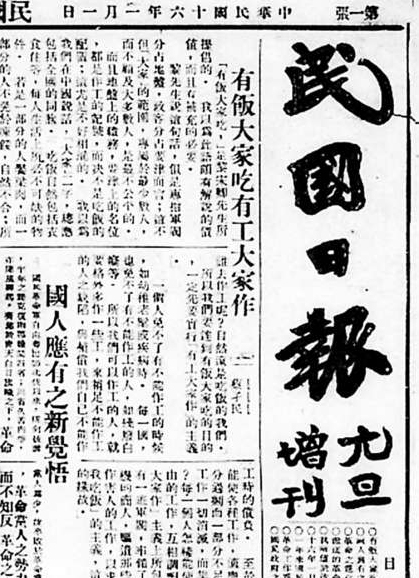 《民國日報》元旦增刊頭版(局部),1927年1月1日。