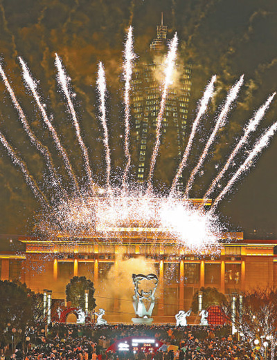 除夕夜,煙花在浙江杭州武林廣場上空綻放。 林云龍 徐 彥攝影報道