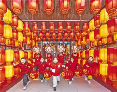 1月21日,在江蘇宿遷泗洪縣青陽街道吾悅廣場上,小朋友在年市長廊里開展“歡樂中國年”主題活動,迎接農(nóng)歷新年。 張連華攝(人民視覺)