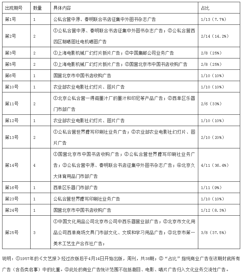 1957年《文藝報(bào)》刊載純商業(yè)廣告統(tǒng)計(jì)表