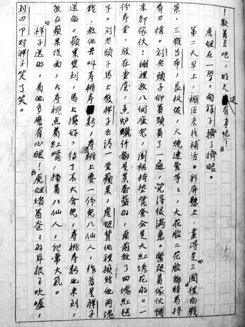 還有一點(diǎn),老舍在原稿上的修琢,也并非只限于個(gè)別字句——他還成行連片甚至是成段落地“推倒重來”呢。他的辦法是沿著魯迅、周作人“精工細(xì)作”的這一路而重來的:把“推倒”那一片先橫格豎行數(shù)清楚,在另一張空白稿紙上照著剪下一塊,然后重書改文,再小心翼翼將“補(bǔ)丁”貼回到原行原格的位置,橫水平,豎齊線,不仔細(xì)盯著看,你幾乎發(fā)現(xiàn)不了這塊“整容”!《正紅旗下》手稿164頁,從前到后粗檢一遍,我至少數(shù)出了作者有七處這樣剪貼的痕跡。這是什么精神?是作者莊重地對(duì)待自己的作品,鄭重地呈給將來的讀者,這樣一種嚴(yán)以責(zé)己、敬以奉世的精神。稍再思之,我們的古來先賢,類似如是地留給人世間精美藝術(shù)品般的手稿,不是屢屢可見的嗎?