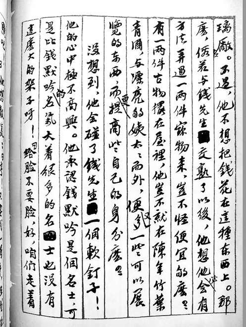 翻開老舍的手稿,確實(shí)可以看到如舒乙所述,它始終是作者自己的手跡(一些話劇劇本曾請(qǐng)秘書幫抄過),就是那么一直到底嚴(yán)守500字小綠格,端端正正、規(guī)規(guī)矩矩,一字一字地寫下來。遇有修改的地方,舊的,用鋼筆水嚴(yán)嚴(yán)實(shí)實(shí)地涂掉(讓你無法辨識(shí)出原來是什么字),然后再十分專業(yè)地勾線,在空白處寫上改后的文字。對(duì)于作者手稿后期工作的出版環(huán)節(jié),編輯人員,排錄人員,校對(duì)人員,面對(duì)這樣的稿子都是一件幸事。舒乙說《正紅旗下》手稿整齊干凈而漂亮,是手稿中的上品、藝術(shù)品、珍藏品,這是“觀千劍而識(shí)器”的內(nèi)行之論。說實(shí)在的,不真?zhèn)€地親自翻一下這件手稿,您對(duì)這些評(píng)述的感覺總還是不落實(shí),虛浮想象。