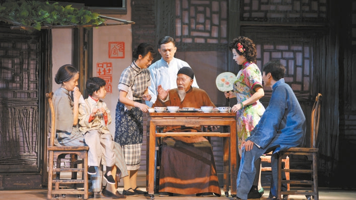 其實,三卷本長篇小說《四世同堂》作為老舍“從事寫作以來最長的,可能也是最好的一本書”,規(guī)模龐大、結(jié)構(gòu)復(fù)雜、人物繁多,問世以來一直被話劇界敬而遠之。雖然改編難度顯而易見,但這也激起了李東的挑戰(zhàn)欲:“這個改編的門檻一旦越過去以后,你就把別人擋在外面了?!背松頌楸本┤藢仙嵛淖值奶厥馇楦?,他也坦言,制作《四世同堂》還有更重要的考量,就是希望能通過做一部戲來向《茶館》致敬,同時也是想在這個過程中探索京味兒戲在創(chuàng)作上更多的可能性。