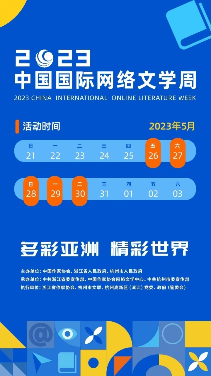 5月27日,由中國(guó)作家協(xié)會(huì)、浙江省人民政府、杭州市人民政府共同主辦的2023中國(guó)國(guó)際網(wǎng)絡(luò)文學(xué)周,即將在浙江杭州開(kāi)幕。