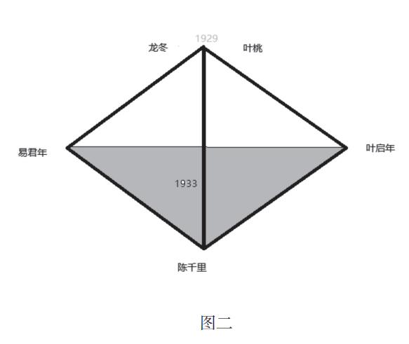 而如果我們進(jìn)一步引申的話,這里其實(shí)還存在著另一組人物關(guān)系三角形——葉啟年、陳千里和易君年。20世紀(jì)20年代中期,還在大學(xué)任教的葉啟年和大多數(shù)中國知識分子一樣,也在思考富國強(qiáng)兵、振興中華的道路。此時,葉啟年正信奉無政府主義思想,并物色優(yōu)秀的年輕人團(tuán)結(jié)在自己身邊。陳千里和易君年都是葉啟年選中的青年學(xué)生,只不過在時代大潮的推動下,兩個人選擇了截然相反的人生道路。陳千里受到葉桃的影響,認(rèn)識到葉啟年的“虛無主義背后,躲著一個投機(jī)分子、野心家”[13],轉(zhuǎn)而接受了共產(chǎn)主義思想;而易君年則不斷追隨導(dǎo)師葉啟年,先是潛伏在中共廣州地下組織內(nèi),行動成功后,繼而利用龍冬的身份,打入中共上海地下組織。從這個角度看,這部小說的情節(jié)人物結(jié)構(gòu),也可以看作一個類似于三棱錐的立體結(jié)構(gòu),葉啟年、陳千里和易君年在1933年初圍繞“千里江山圖”計劃展開的對決,構(gòu)成了這個三棱錐的底面;他們的行動最終都指向了歷史(也就是三棱錐的頂點(diǎn)),即1929年死去的龍冬和葉桃(見圖二)。
