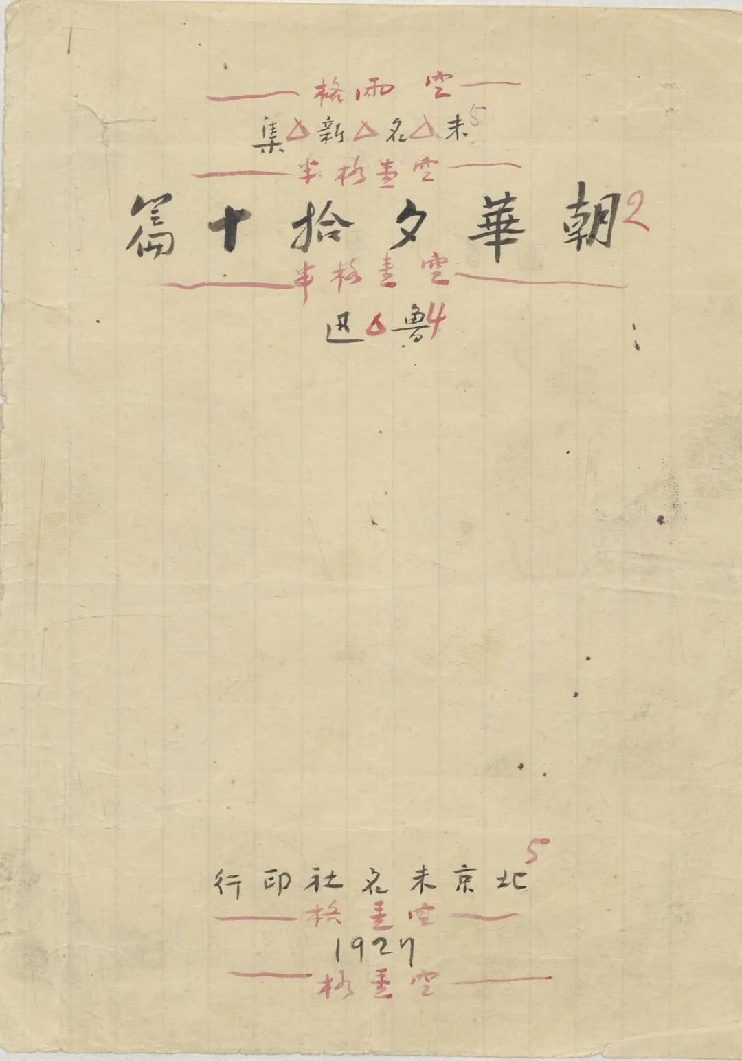 1.《朝花夕拾》現(xiàn)存所有手稿:包括2篇小引、1篇后記、7篇散文,另有目錄和扉頁(見插圖)?!冻ㄏκ啊匪?0篇回憶散文原以“舊事重提”為總題名發(fā)表于《莽原》半月刊,因此手稿中都有副標(biāo)題“舊事重提之X”。這批手稿修改較多,目錄、扉頁、《小引》副稿都有魯迅本人朱筆標(biāo)注的排印格式。《二十四孝圖》《五猖會》《無?!贰陡赣H的病》《后記》等5種手稿都有紅筆標(biāo)格式字號等,是用于排印發(fā)表留下的痕跡?!冻ㄏκ啊犯寮慕豁f素園、李霽野、臺靜農(nóng)等,魯迅去世后由李霽野交還許廣平。