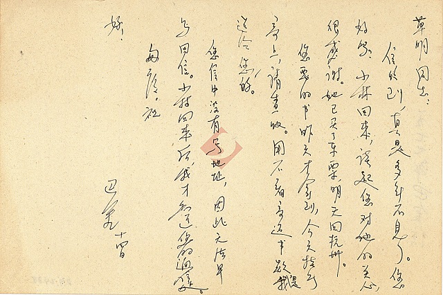 您信中沒有寫地址,因此無法早寫回信。小林回來后,我才知道您的通信處。
