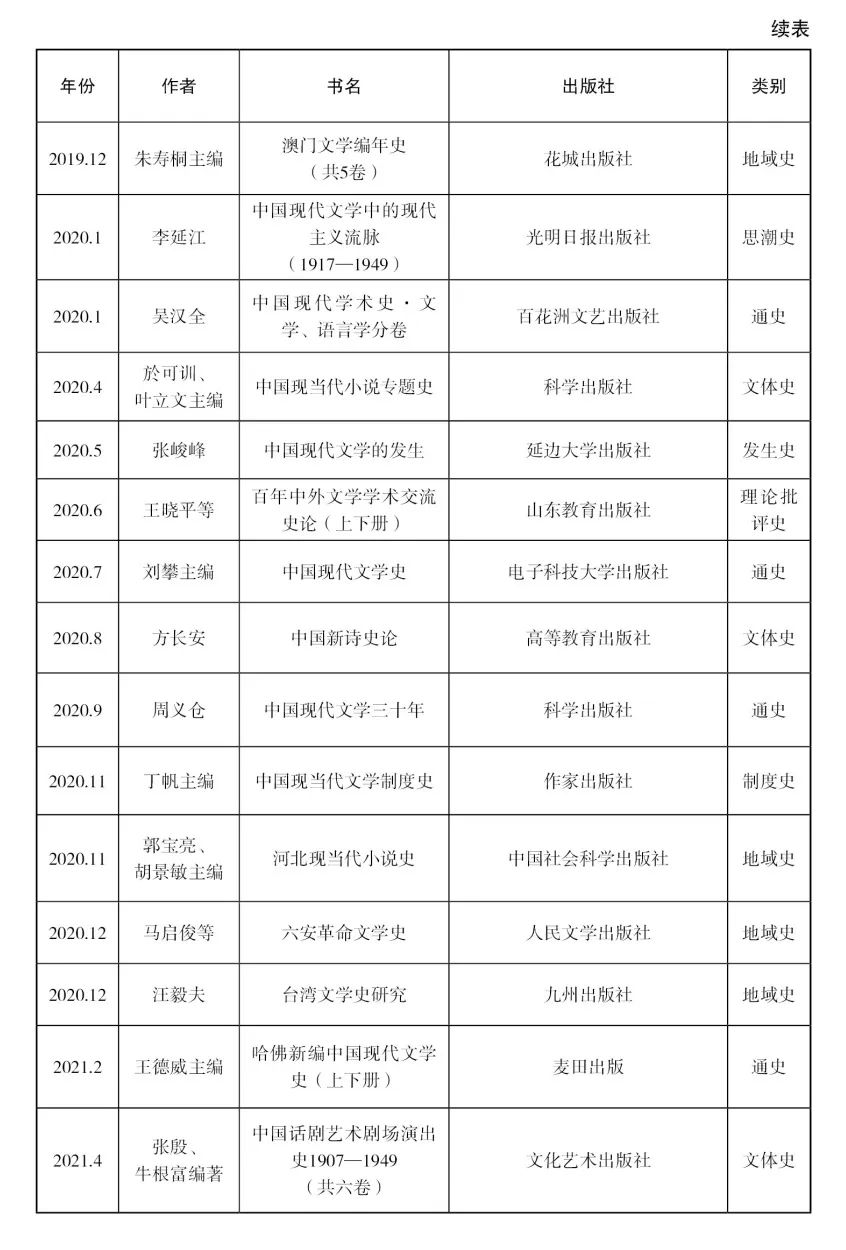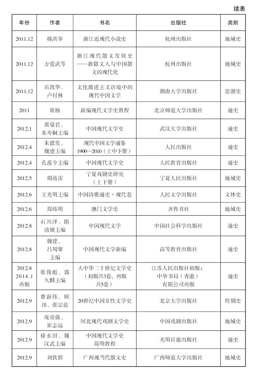 [29]該著第一版出版于1999年,主編為朱棟霖、丁帆、朱曉進,后又由高教社和北京大學出版社出版了多個版本。筆者在整理近十年文學史著作目錄時,為了保持體例一致,對于這些初版本已經在此前的目錄中收錄過、但最近又出新版的著作,一概沒有收入。