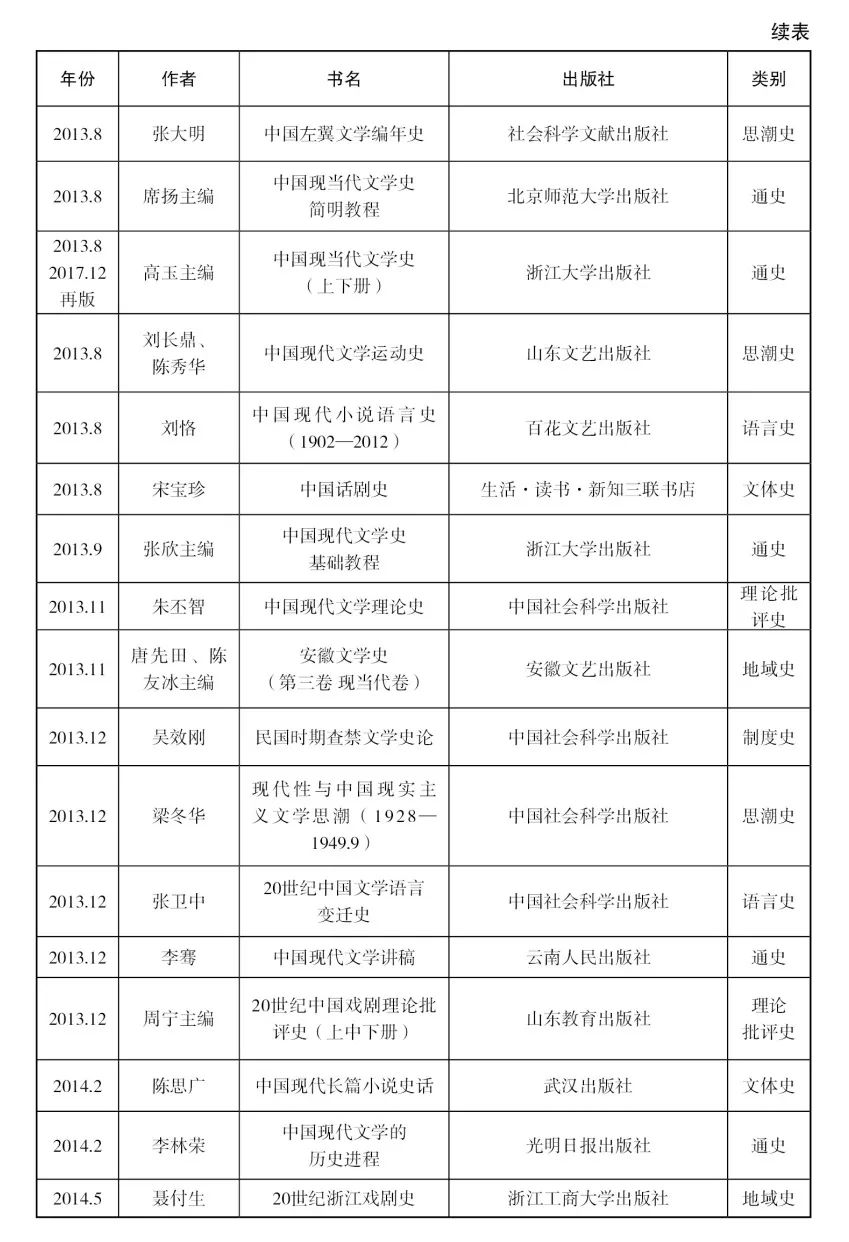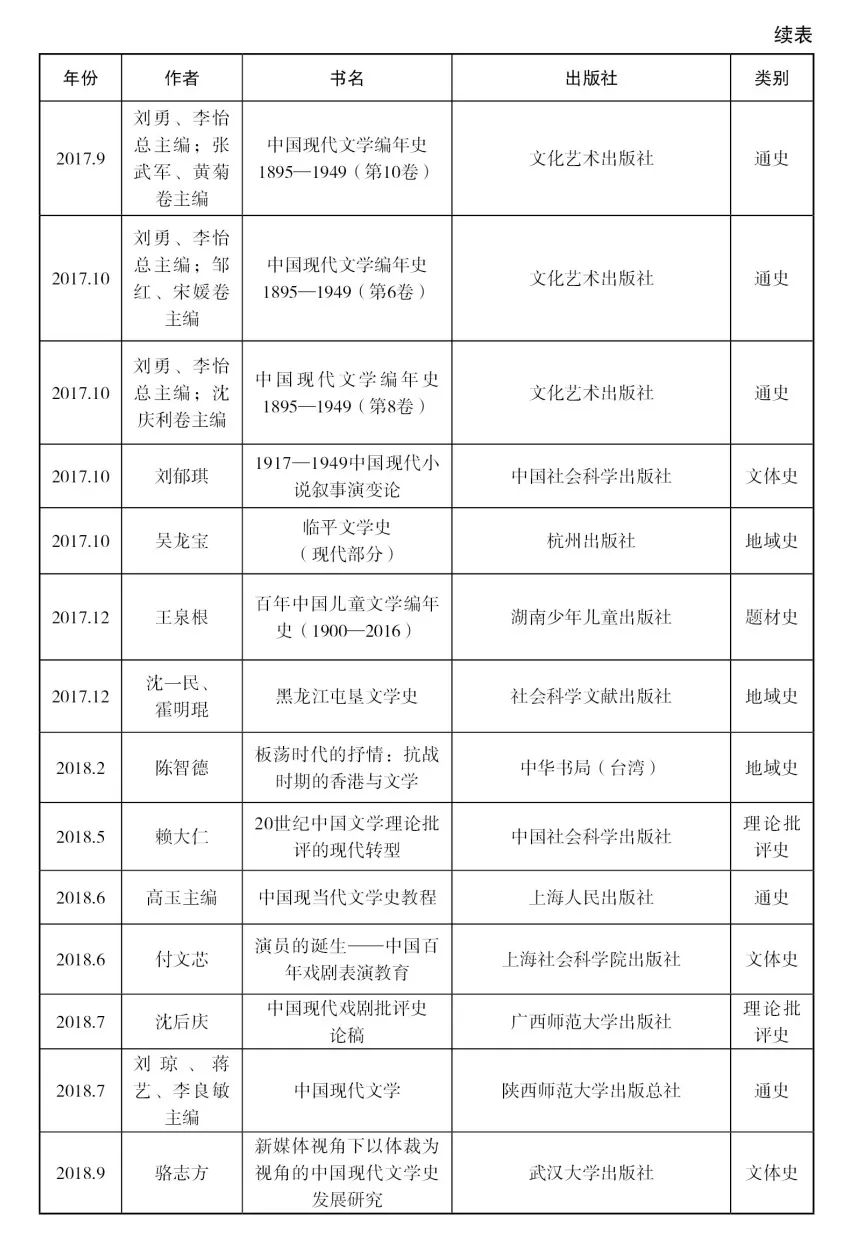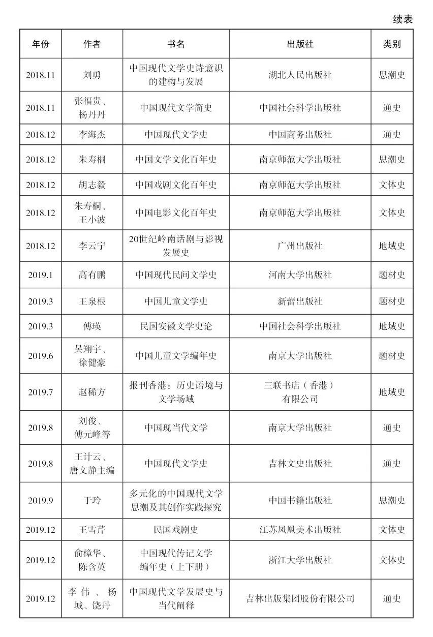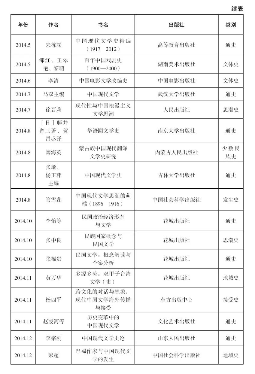 除此二者之外,還有一些情況需要略作解釋。第一,總體來看,現代文學史與當代文學史在史觀、問題意識等方面還是存在較大差別的,整理與分析當代文學史的工作超出了筆者的能力范圍,本目錄未收錄單純的當代文學史。第二,某些通史或地域史類著作,往往研究范圍縱貫古代文學和現當代文學,如果其中現代文學部分所占比例或篇幅較大,也酌情收入。第三,對于在國外出版的著作,僅收入截至目前已有中文譯本的,其余則不收入。第四,目錄中所有著作均按出版時間先后排序,個別著作只知出版年份,具體月份不詳,則列在該年末尾;凡有多個版本的著作,均只列為一個條目,并按初版時間排序。依此原則,本目錄中只收近十年來首次出版的著作,近十年間再版的史著概不收入。