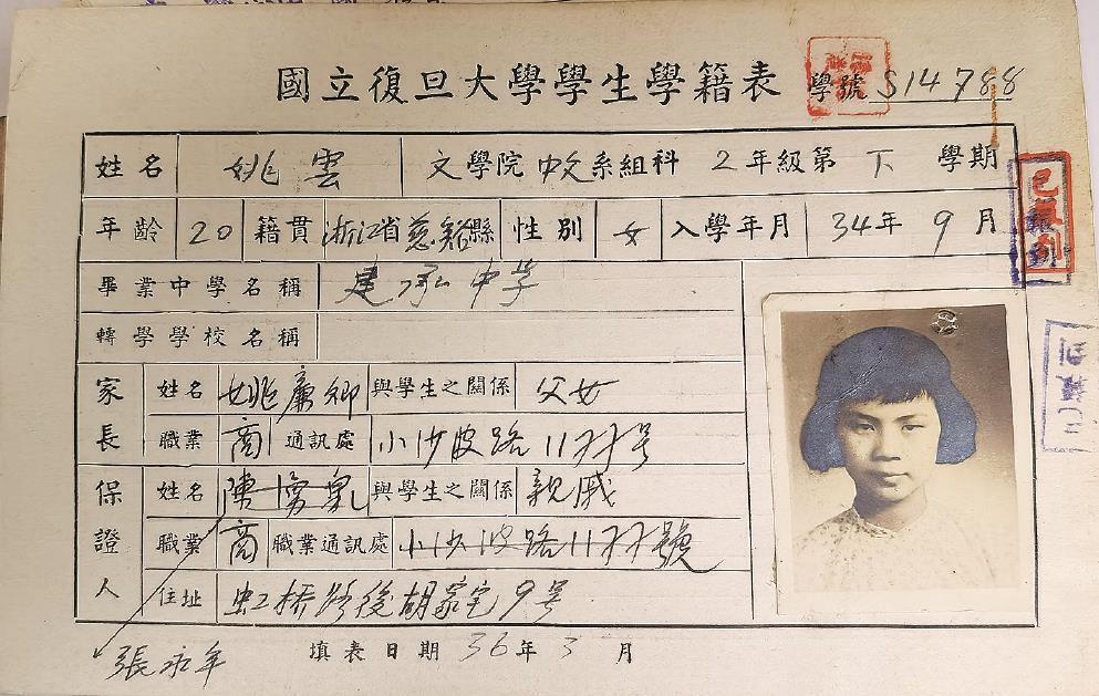 1948年,物價飛漲,經(jīng)濟急劇下滑,“蔣經(jīng)國來滬‘打老虎’,規(guī)定黃金、白銀和美元等必須兌換成金圓券,銀樓業(yè)經(jīng)手的就是黃金白銀,因此引發(fā)全上海銀樓關(guān)門停業(yè)”,姚云父親的“老寶鳳”也關(guān)店了。11月17日,憂心如焚的姚廉卿突發(fā)心臟病去世。姚云說:“那年他六十五歲,母親五十歲,我二十一歲。我一直握著他的手,整整一夜守在他的身邊……”檔案里,有一張姚云的《國立復(fù)旦大學(xué)三十七學(xué)年度春季舊生近況調(diào)查表》,填寫日期似在1949年初,在“父母存歿”一欄里,寫著“父歿母存”四字;在“家長”一欄里,寫著姚云母親的名字:姚汪良貞。