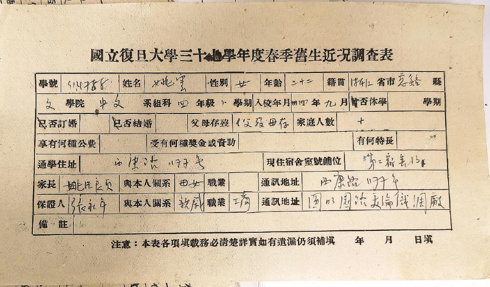 姚云的《學(xué)生學(xué)籍表》和《舊生近況調(diào)查表》,均復(fù)旦檔案館藏