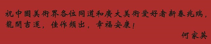 5、中國美術(shù)家協(xié)會原副主席 何家英:祝中國美術(shù)界各位同道和廣大美術(shù)愛好者新春兆瑞,龍開吉運(yùn),佳作頻出,幸福安康!