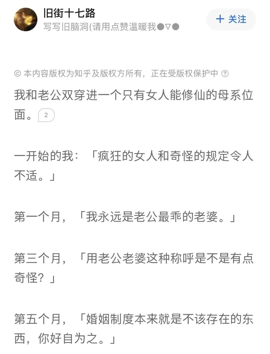 直至生命末尾仍在奉獻(xiàn)自身的家庭主婦“我”,在與丈夫的自駕游中意外穿越到女性為優(yōu)勢(shì)性別的修仙界“女越界”,并一步步覺(jué)醒。在對(duì)男頻爽文典型男主形象的戲諷中,女越界一點(diǎn)點(diǎn)解答著“我”疑惑與矛盾。隨后,在“我”解救遭重男輕女觀(guān)念迫害的女孩的過(guò)程中,小說(shuō)借助快穿、系統(tǒng)等設(shè)定解開(kāi)了“元敘事”,將性別問(wèn)題置換為快穿世界的前因,以此說(shuō)明快穿世界崩塌后女越界的形成,以及曾經(jīng)對(duì)女越界做出巨大貢獻(xiàn)的“我”如今無(wú)知愚昧的原因。
