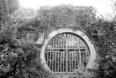 從老街拐進(jìn)短巷進(jìn)去不過二十幾米,是一個雜亂的大雜院,像是兵荒馬亂倉促出逃后留下的一片狼藉。向左拐,赫然看到一座園門,常見的園林月洞門,只是兩邊墻上及門上全都爬滿著爬藤植物,木本植物恣意瘋長,臺階上生著雜草和苔蘚,圓形門洞里的鏤空鐵門上突兀地倚著一個大掃帚。園門上方和左手墻上隱約有雕刻的文字,可惜全被植物覆蓋了。