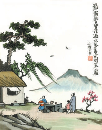 馬上就要離開桂林師范學(xué)校了,豐子愷給同事們畫了不少漫畫,留作紀(jì)念,這些畫的畫題都是元人呂思誠(chéng)《戲題》中的“嚴(yán)霜烈日皆經(jīng)過,次第春風(fēng)到草廬”。他說:“同事中多顛沛流離而來者,得此畫可資振作?!?/p>