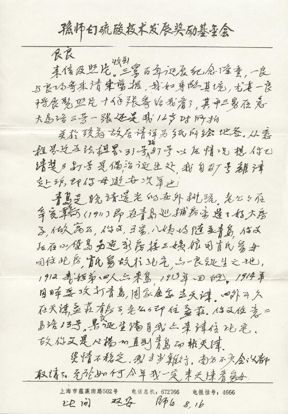 1991年夏,師白表伯曾在來(lái)信中說(shuō),他原計(jì)劃要偕妻女北上看望舅母,并參加弢翁百年誕辰的紀(jì)念活動(dòng),還要和同窗摯友吳大任教授(著名數(shù)學(xué)家)同返南開(kāi)中學(xué)。然而,由于“必須參加”一年一度的全國(guó)硫酸技術(shù)交流會(huì)而不得不作罷。