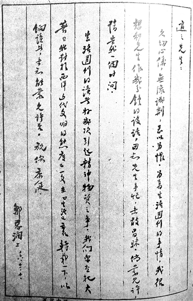 久切心儀,無緣識荊,至以為悵。為著《生活》周刊的事情,我很想和先生作幾分鐘的談話。因知先生事忙,未敢冒昧。倘蒙見許,請告我一個時間。