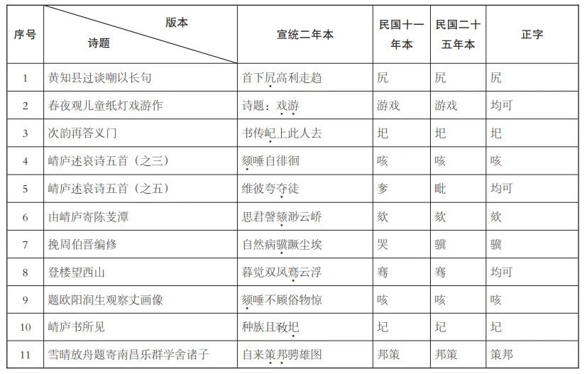 在《續(xù)集》部分,也即宣統(tǒng)元年至民國(guó)十年共13年所作的877題詩(shī)歌中,民國(guó)十一年本與民國(guó)二十五年本相較,共有31處異文,前者正確僅5處,正確率只有16%,后者正確29處,正確率高達(dá)94%。