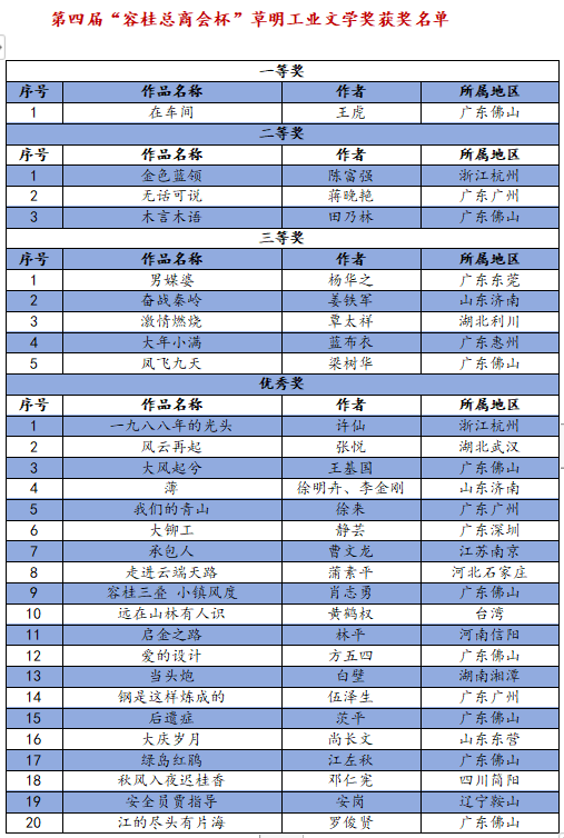 第四屆“容桂總商會(huì)杯”草明工業(yè)文學(xué)獎(jiǎng),吸引了全國(guó)各地一大批作家和文學(xué)愛好者參加,共收到來(lái)稿326篇,其中小說(shuō)作品205篇,報(bào)告文學(xué)作品121篇,初選入圍作品60篇。作品題材涵蓋各個(gè)工業(yè)戰(zhàn)線的各個(gè)領(lǐng)域,描述產(chǎn)業(yè)工人、創(chuàng)業(yè)者的心路歷程和人生感悟,展現(xiàn)在工業(yè)時(shí)代中奮力拼搏的創(chuàng)業(yè)故事。經(jīng)過(guò)中國(guó)冶金作家協(xié)會(huì)副主席劉盛超等評(píng)委對(duì)參評(píng)作品進(jìn)行初評(píng)和終評(píng),最終評(píng)選出一等獎(jiǎng)1名、二等獎(jiǎng)3名、三等獎(jiǎng)5名,以及優(yōu)秀獎(jiǎng)20名。