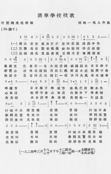 另見徐葆耕著《老校歌與清華傳統(tǒng)》一文(收入其《紫色清華》一書,民族出版社,2001),作者提到“汪鸞翔先生作詞、張惠珍女士譜曲的《清華校歌》,傳唱一時(shí),堪稱佳作”。