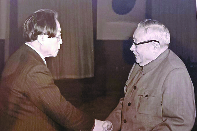 1982年12月,廖承志(右)在北京人民大會(huì)堂會(huì)見(jiàn)野間宏。
