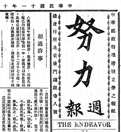 《努力》周報(bào)1922年12月24日刊載,胡適因病離校休養(yǎng)啟事