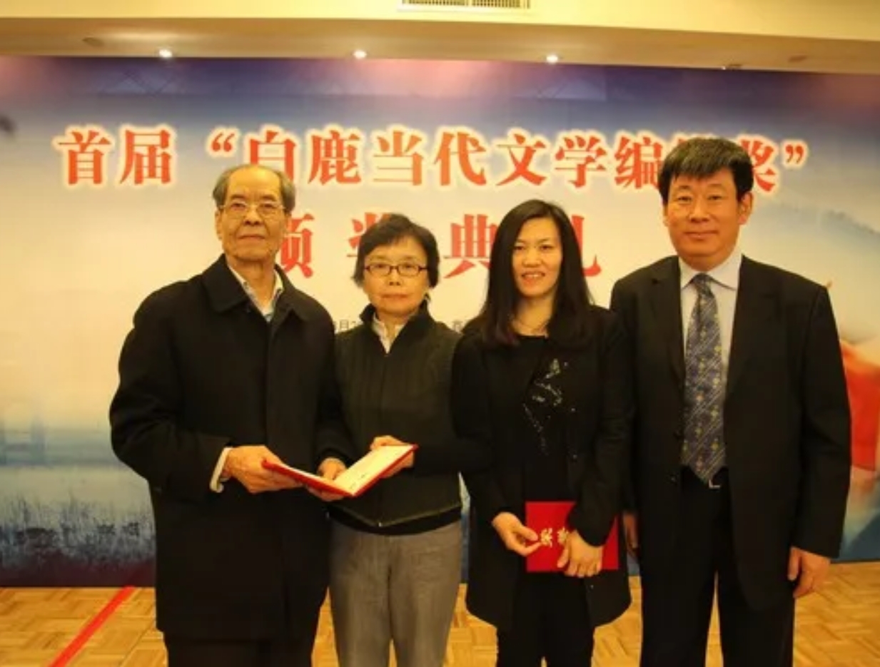 忠實先生對編輯工作十分尊重,對過去在《白鹿原》編輯和出版過程中編輯的努力總是念念不忘。有一年,他提議用他的部分稿費作為基金,與人民文學出版社一起,設立一個“白鹿當代文學編輯獎”,以表彰人民文學出版社在當代文學出版工作中做出突出業(yè)績的編輯,我們當然欣然同意。首屆獎項除了設立了“正獎”,還特別設立了“《白鹿原》出版紀念獎”,對每一位在《白鹿原》編輯出版方面有過貢獻的編輯一一給予獎勵,以表達陳忠實先生對這些無名英雄的感激之情,由此也體現(xiàn)出陳忠實先生的高貴品格。這一舉動,在文學出版界,一時傳為佳話。這一次,陳忠實先生親自來京出席了頒獎會,我與忠實先生一起為獲“正獎”的兩位編輯頒獎,先生的臉上露出真誠的微笑。我與忠實先生還有兩位獲獎編輯的合影一直珍藏在我的相冊里……