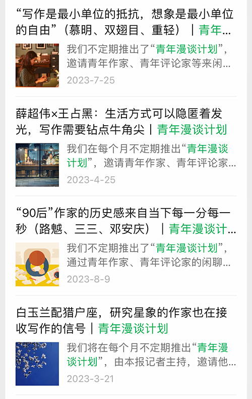過去的前輩作家們,喜歡將自己隱藏在作品之后,保持某種神秘感。如今青年作家的涌現(xiàn)讓我們看到了更多寫作者身上的幻彩人生,他們不再遮掩自己的偏好,他們樂于表達自己的觀察,他們愿意打開自己聯(lián)結更多的人?;蛟S他們的寫作依然還在起點,仍在勃發(fā),但我們從這兩個欄目中,讓讀者看到了真誠可感的“同代作家”。當有讀者表示自己因為這些文字被理解、被共情時,我想,這就是誕生意義的閃光處,也是我們繼續(xù)與之同行的美好動力。