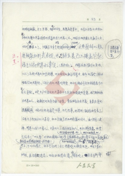 該稿共43頁,作者用藍(lán)黑墨水在“人民文學(xué)15X16=240”的稿紙上進(jìn)行創(chuàng)作。每張手稿右上角均有頁碼標(biāo)識,其中包括第1-37頁,第39-44頁。不知什么原因,該稿并沒有第38頁。經(jīng)筆者細(xì)讀,并與《人民文學(xué)》上發(fā)表的《哥德巴赫猜想》對照,發(fā)現(xiàn)該稿第37頁與第39頁的內(nèi)容前后連貫,很有可能是作者將第38頁錯(cuò)標(biāo)為第39頁。