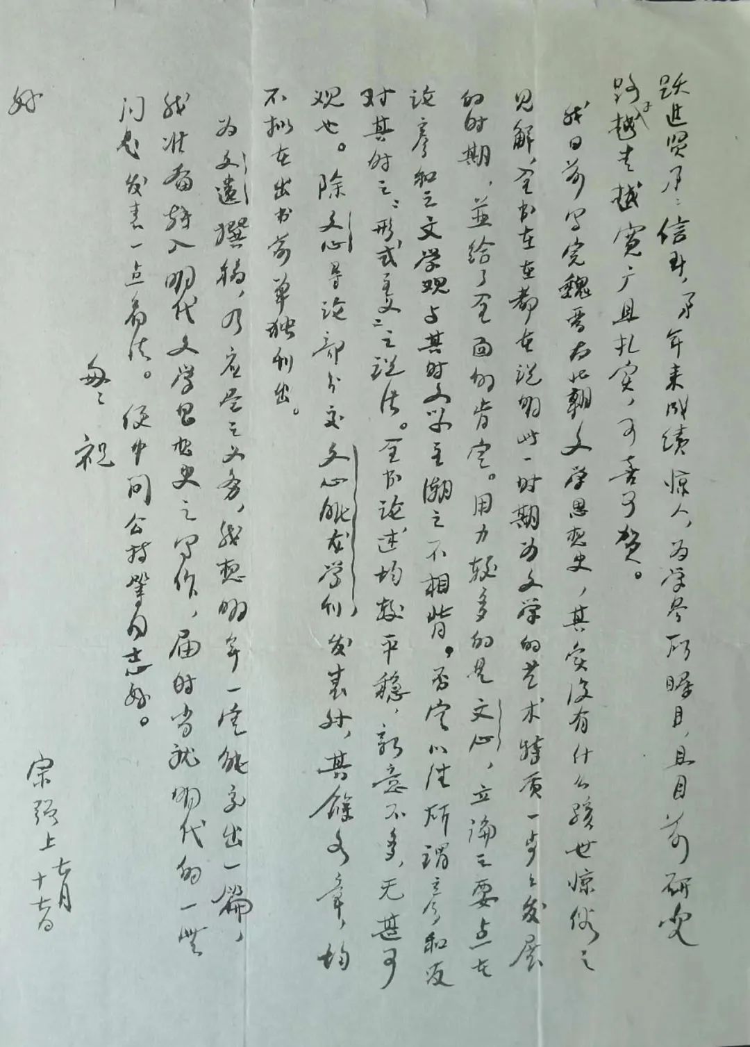 躍進賢弟:信到。弟年來成績驚人,為學界所矚目,且目前研究路子越走越寬廣且扎實,可喜可賀。我日前寫完《魏晉南北朝文學思想史》,其實沒有什么駭世驚俗之見解,全書都在說明此一時期為文學的藝術(shù)特質(zhì)一步步發(fā)展的時期,并給了全面的肯定。用力較多的是《文心》,立論之要點在論彥和之文學觀與其時文學主潮之不相背,否定以往所謂彥和反對其時之“形式主義”之說法。全書論述均較平穩(wěn),新意不多,無甚可觀也。除《文心》導論部分交《文心雕龍學刊》發(fā)表外,其余各章均不擬在出書前單獨刊出。為《文遺》撰稿,乃應盡之義務,我想明年一定能交出一篇,我準備轉(zhuǎn)入明代文學思想史之寫作,屆時當就明代的一些問題發(fā)表一點看法。便中問公持等同志好。