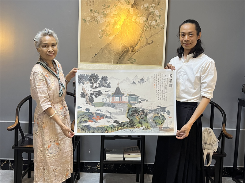 陳星州把根據(jù)林白小說(shuō)描述的景蘇樓、沙街等而創(chuàng)作的畫作《景蘇樓》贈(zèng)送林白。 (吉小吉 攝)