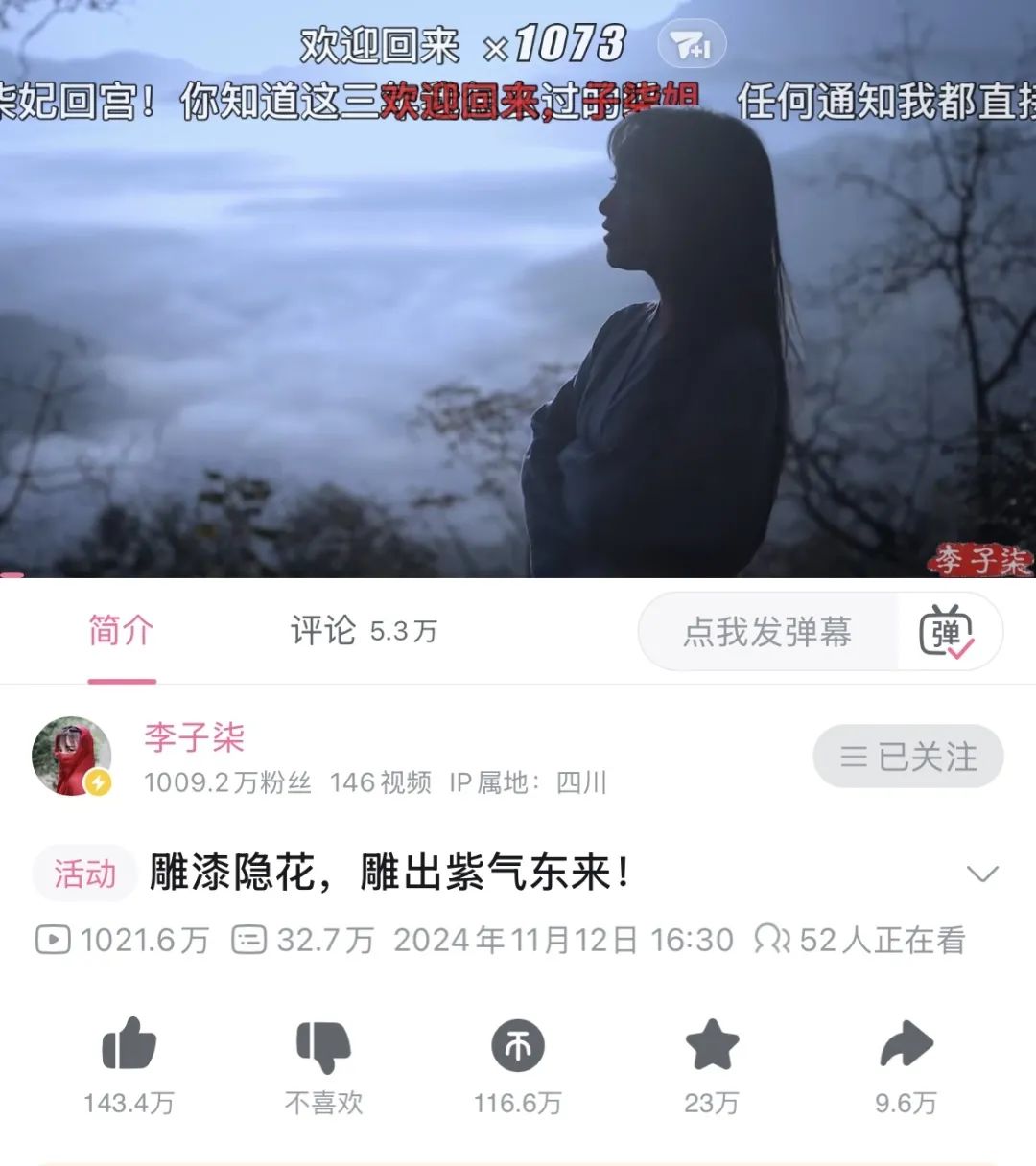 第二類(lèi)是“有文化”。1個(gè)月之前,停更三年多的up主李子柒在各短視頻平臺(tái)宣布回歸,復(fù)更關(guān)于大漆技藝制作的視頻“雕漆隱花,雕出紫氣東來(lái)”,全平臺(tái)播放量過(guò)億,在評(píng)論區(qū)和彈幕區(qū)隨處可見(jiàn)“歡迎回來(lái)”“今夕是何年”“爺爺/奶奶,你關(guān)注的up主更新了”等網(wǎng)友留言,近乎形成了某種現(xiàn)象級(jí)的“集體狂歡”。