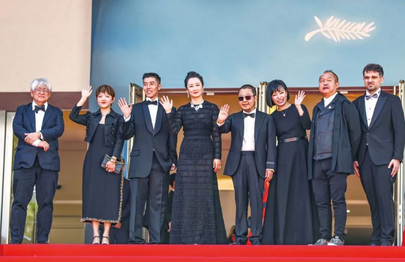2024年5月18日,在法國南部小城戛納舉行的第77屆戛納國際電影節(jié)上,影片《風(fēng)流一代》導(dǎo)演賈樟柯(左三)攜主創(chuàng)出席首映禮。新華社記者高靜攝