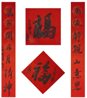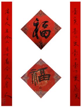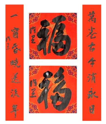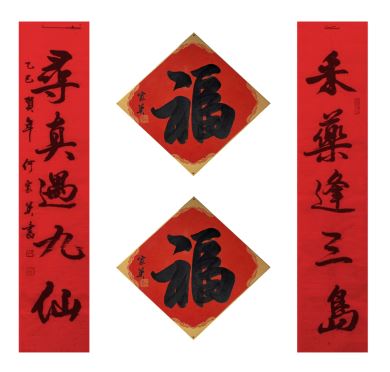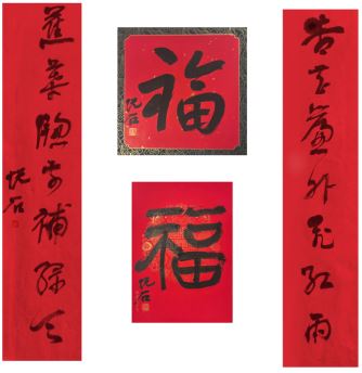 中國美術(shù)家協(xié)會(huì)名譽(yù)主席、中央文史研究館副館長馮遠(yuǎn)書對聯(lián):“祥龍騰云辭舊歲,靈蛇納福迎新春?!?/p>